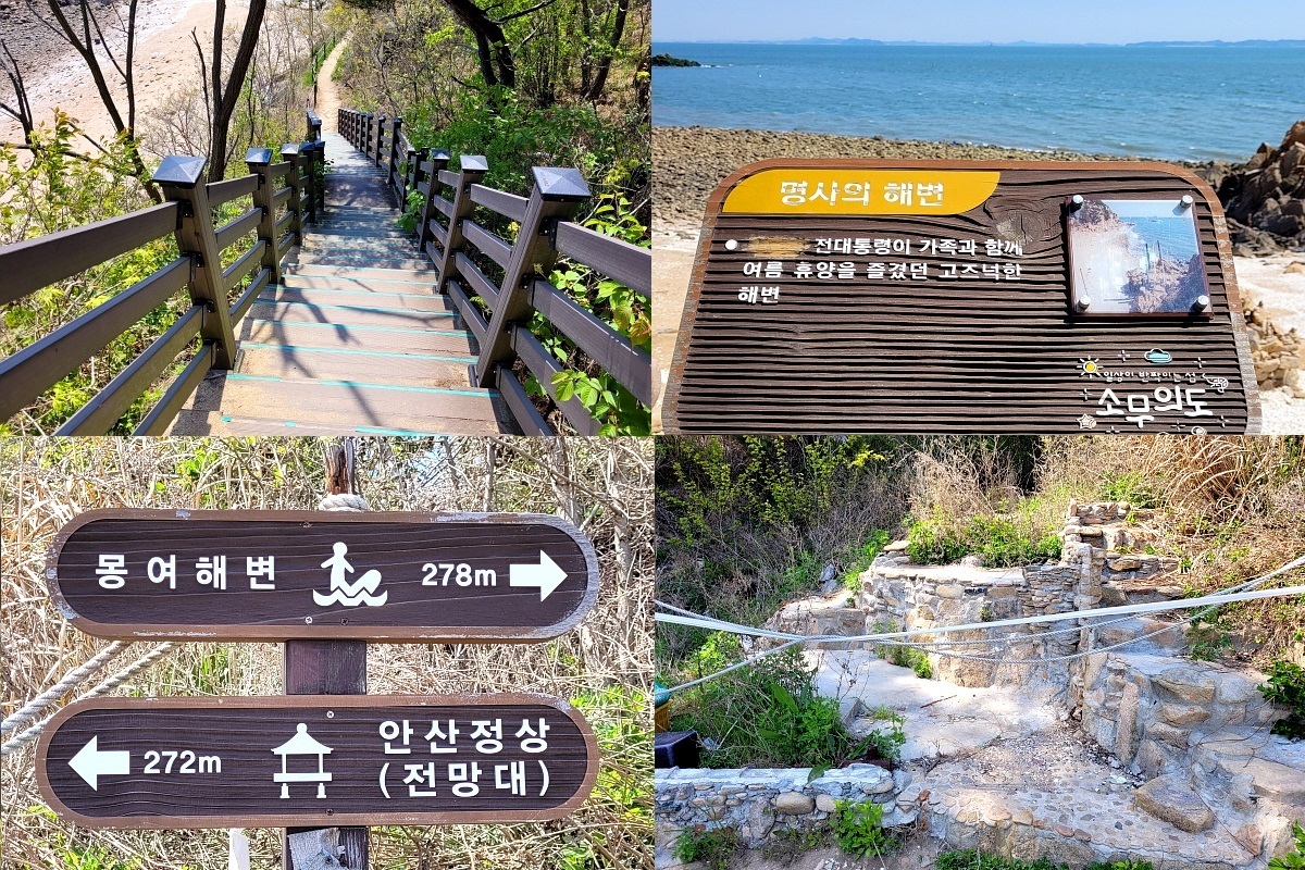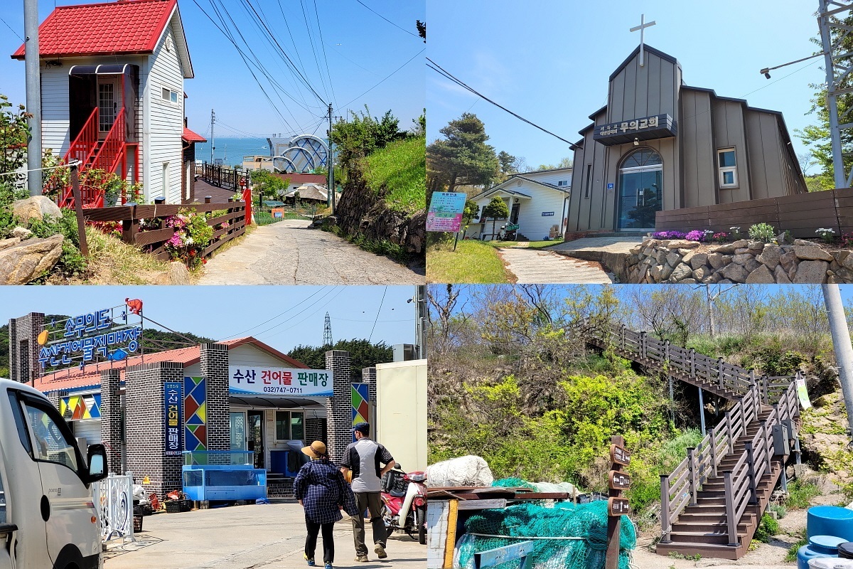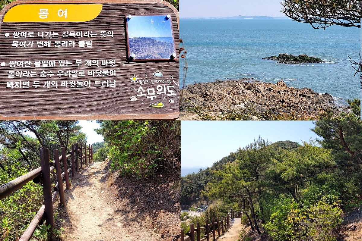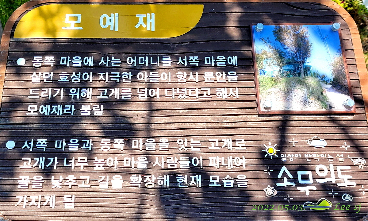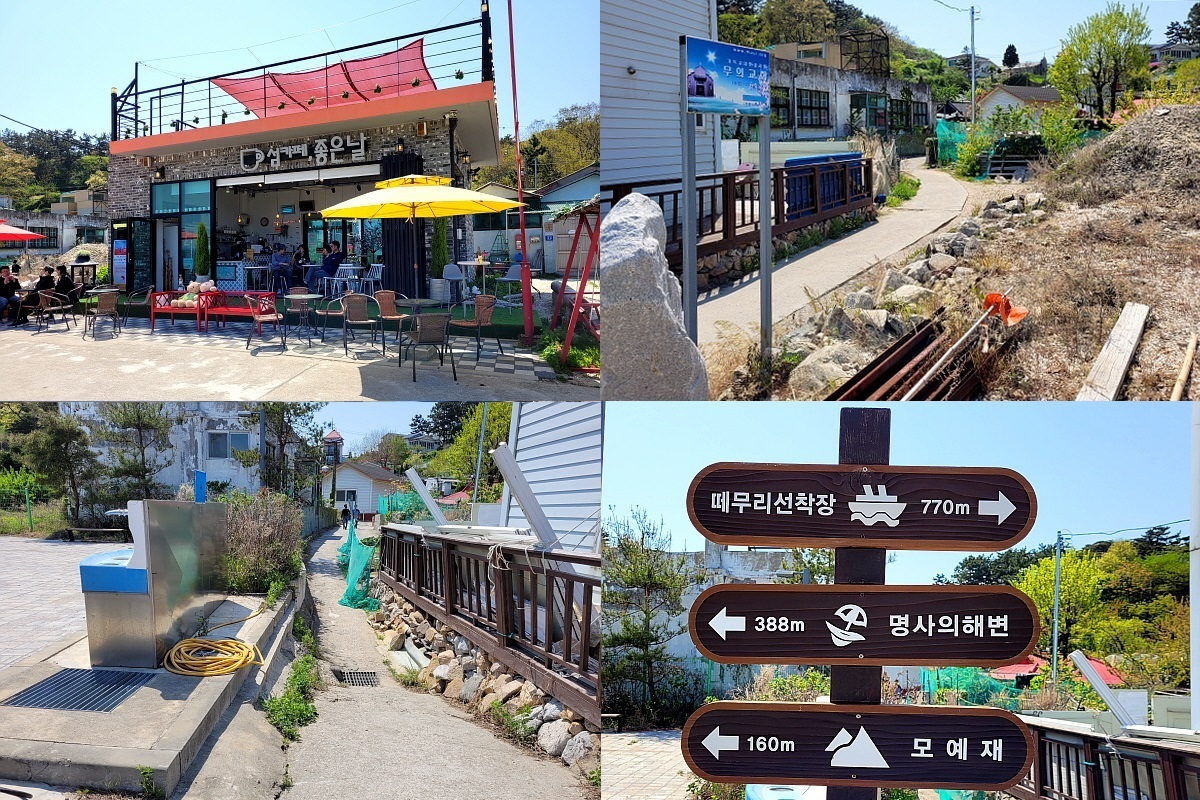 소무의대교 건너 바로 산꼭대기로 이어지는 계단이 싫어 시계 바늘 방향으로 걷는데 도중에 골목이 있어 올라가 보니 모예재, 언덕 넘어에 큰 건물이 보이는데 바로 내려가면 몽여 해변이 된다. 모예재를 그냥 넘어가면 거리가 너무 짧아 도로 내려와 건어물 매장 앞 계단으로 오른다.