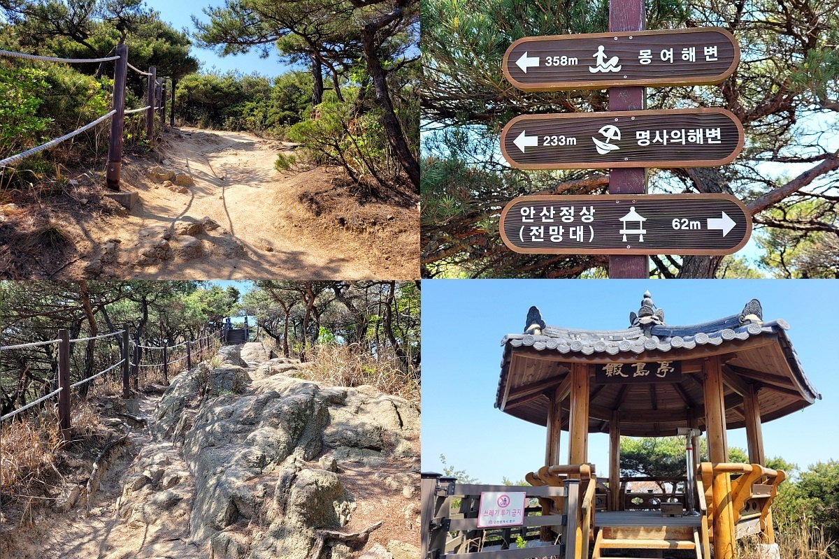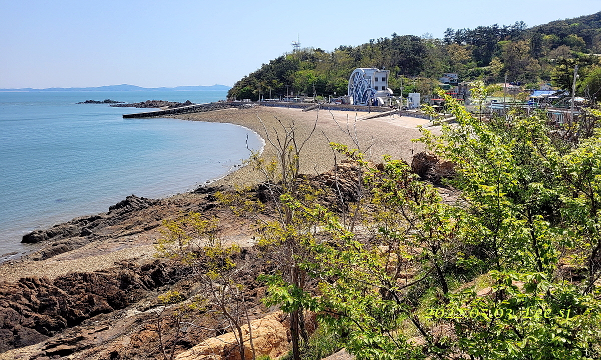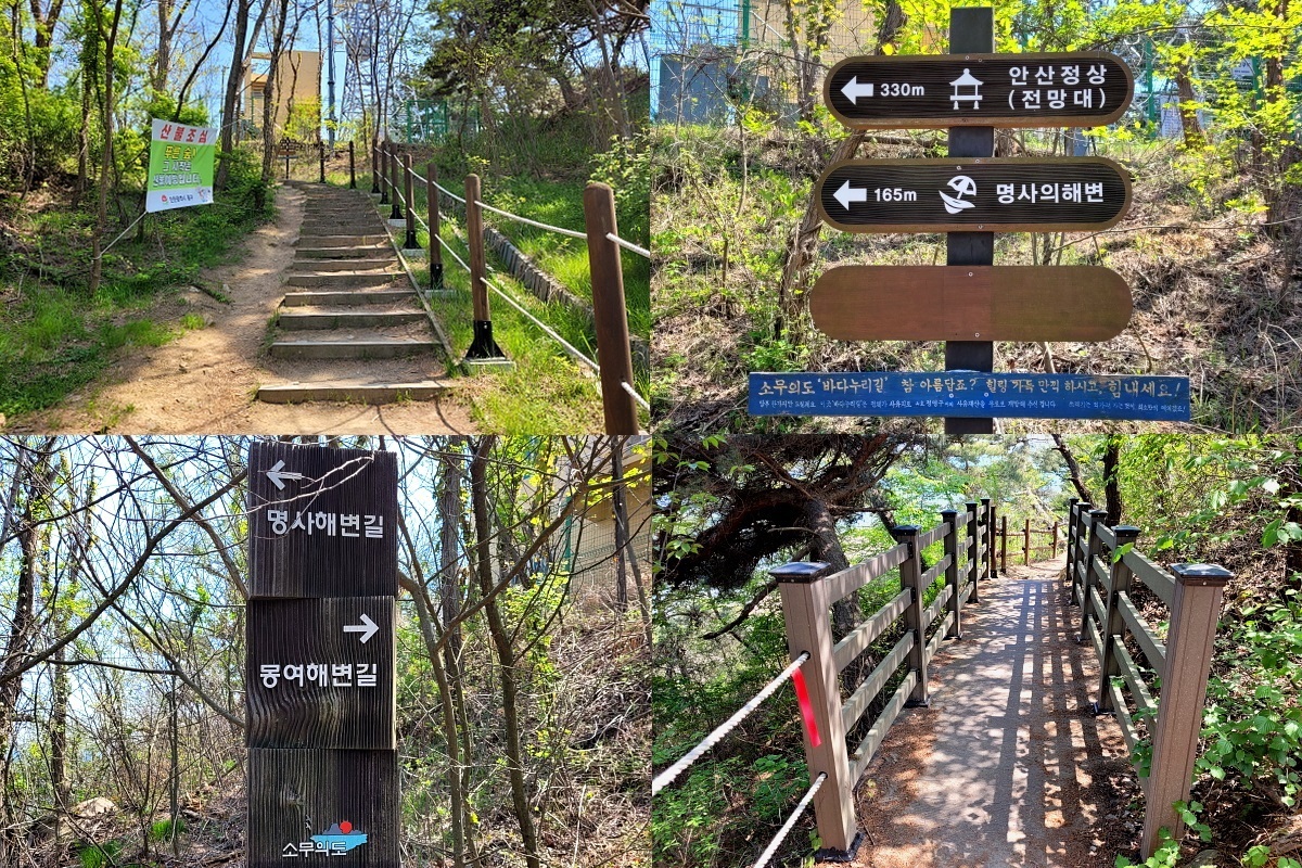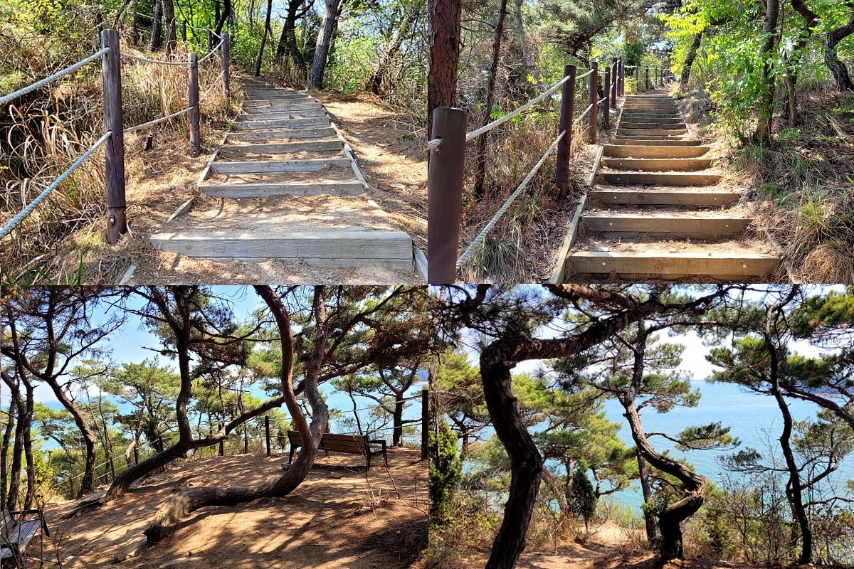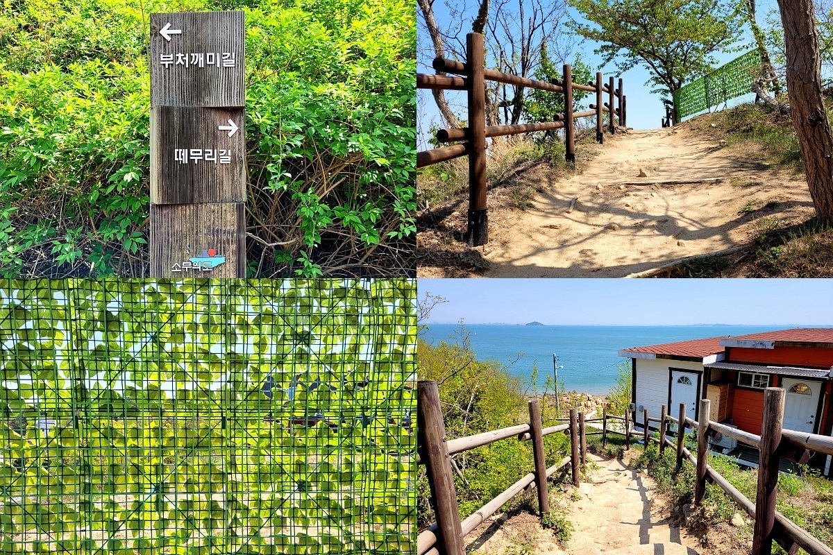소무의대교 건너 바로 산꼭대기로 이어지는 계단이 싫어 시계 바늘 방향으로 걷는데 도중에 골목이 있어 올라가 보니 모예재, 언덕 넘어에 큰 건물이 보이는데 바로 내려가면 몽여 해변이 된다. 모예재를 그냥 넘어가면 거리가 너무 짧아 도로 내려와 건어물 매장 앞 계단으로 오른다.