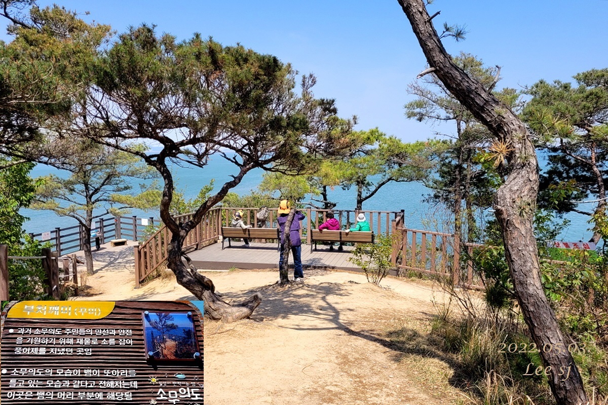 다리 건너 소무의도 안내석에서 시작(13:35)하여 모예재도 올라 반대편 구경하고 도로 내려오고, 중간 중간 전망대에서 바다감상, 정상 팔각정에서도 마냥 쉬고 내려와 안내석 앞에 다시 서니 15:00,