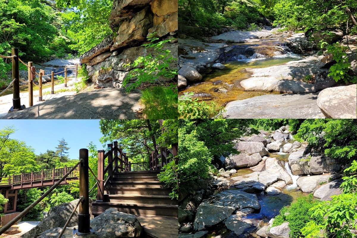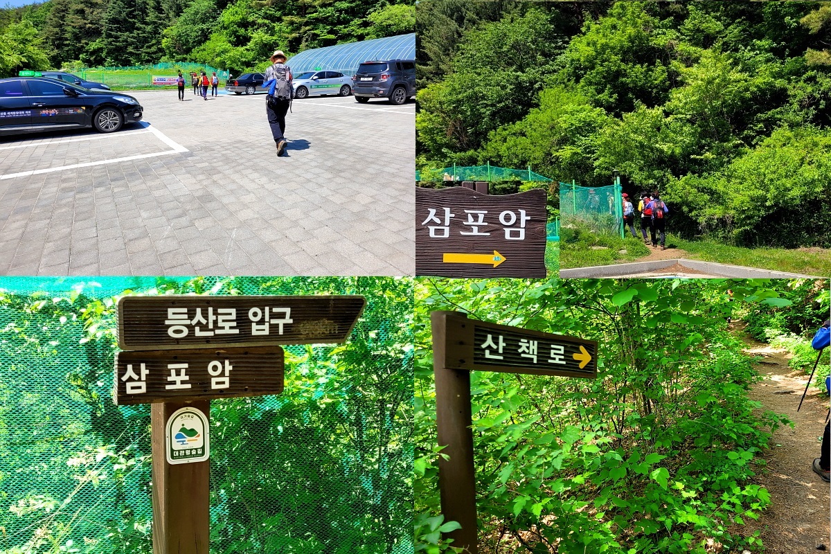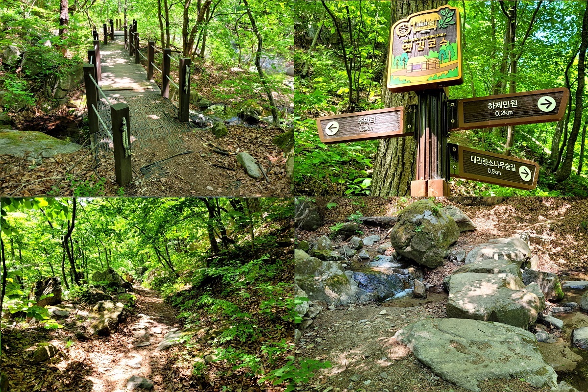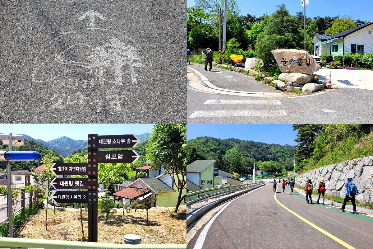 트레킹 코스는 : 어흘리 주차장에서 시작하여 상포암, 솔숲교, 숯가마, 금강송정, 대통령 쉼터 전망대,