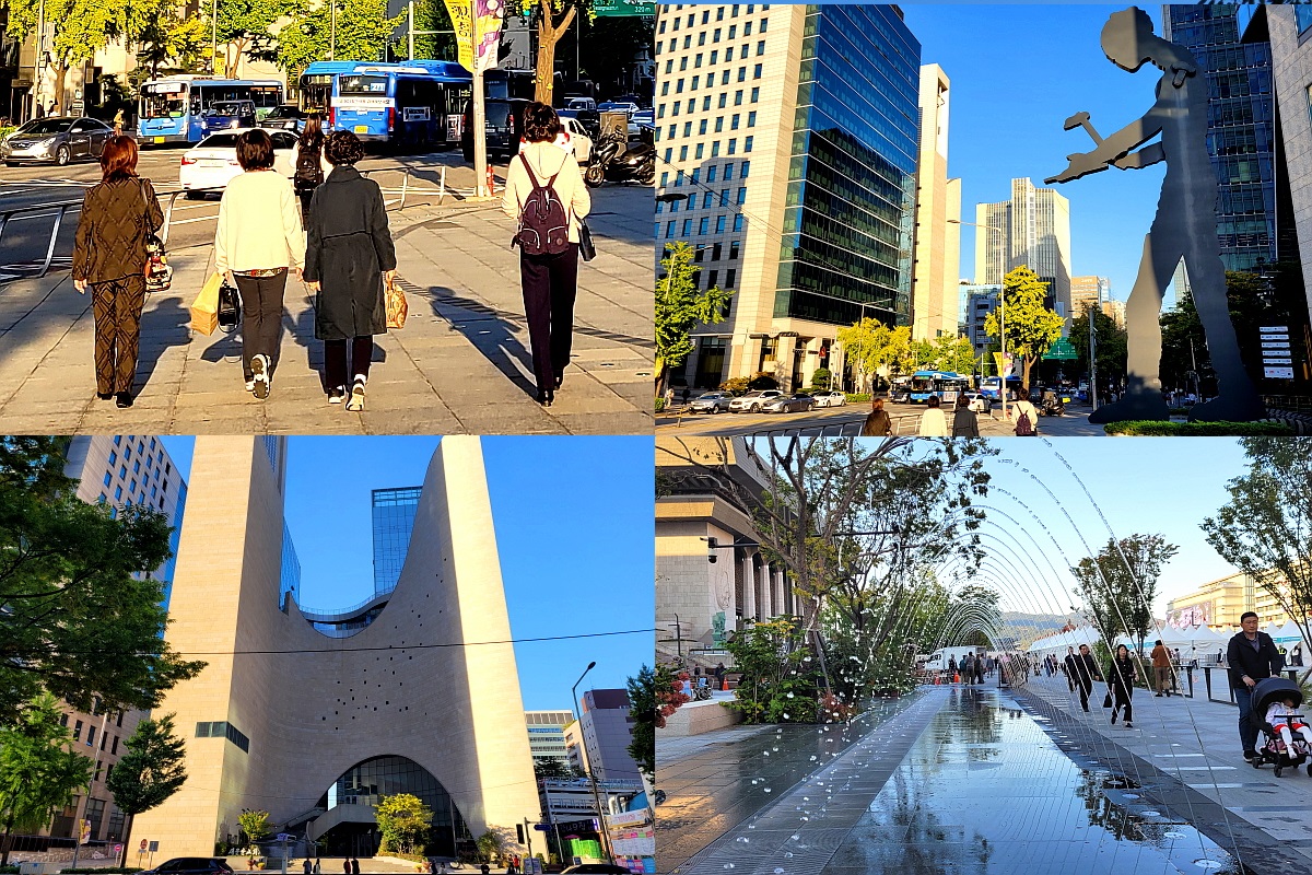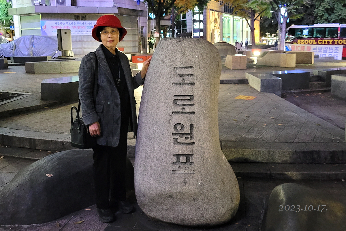 참새가 방앗간 들리 듯 단골집 ㄹㅇ엘 모자점 들러 군중 심리에 빨간 색으로 또 하나 구입, 다시 걸어 나와 '도로원표' 앞 의자에 앉아 잠시 휴식, 한 사람은 도로원표 뜻을 아직 모르고 있었다기에 설명 해주고, 기념 남기고 각자 집으로~
