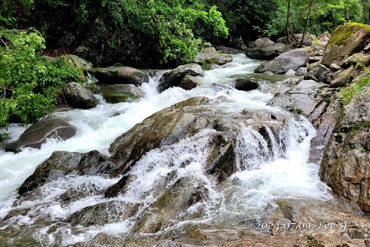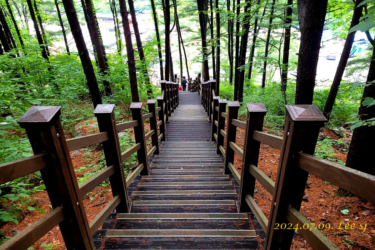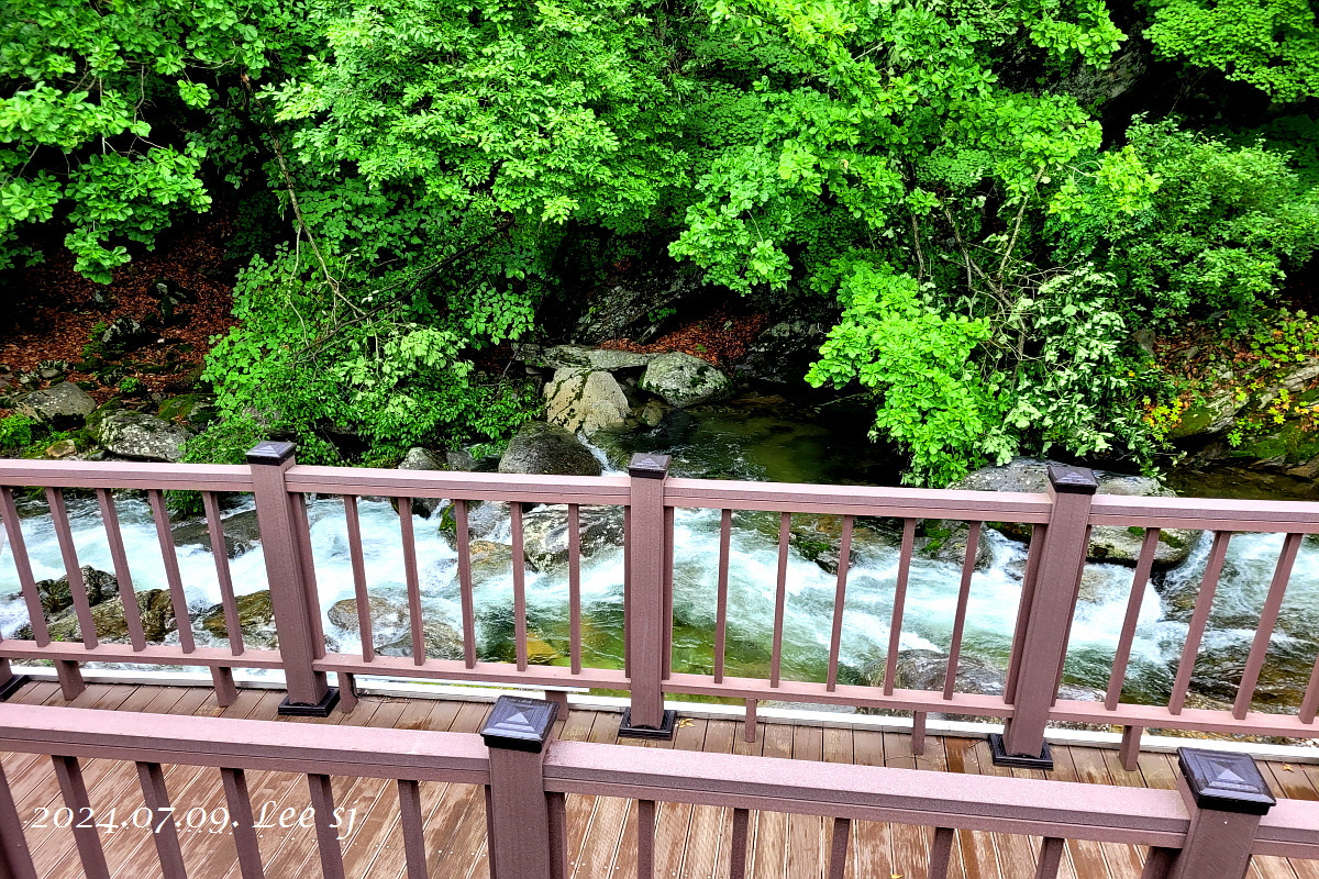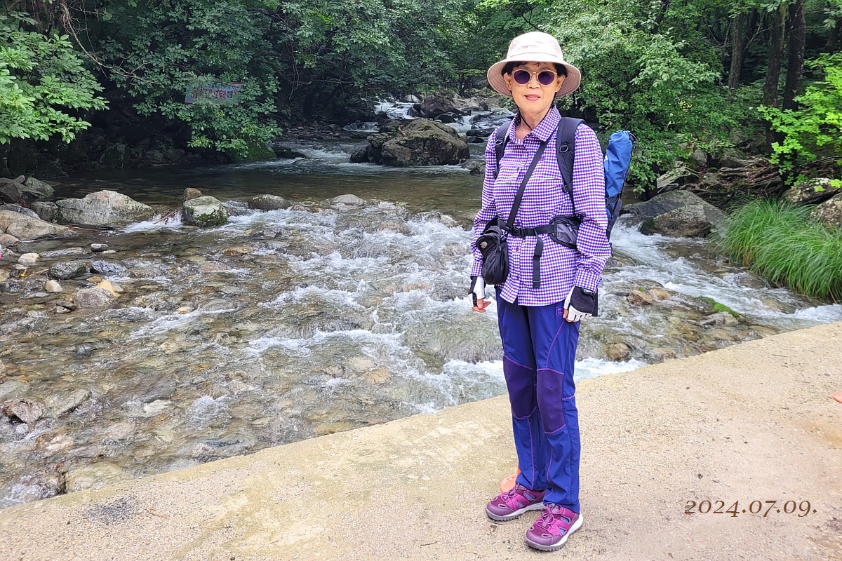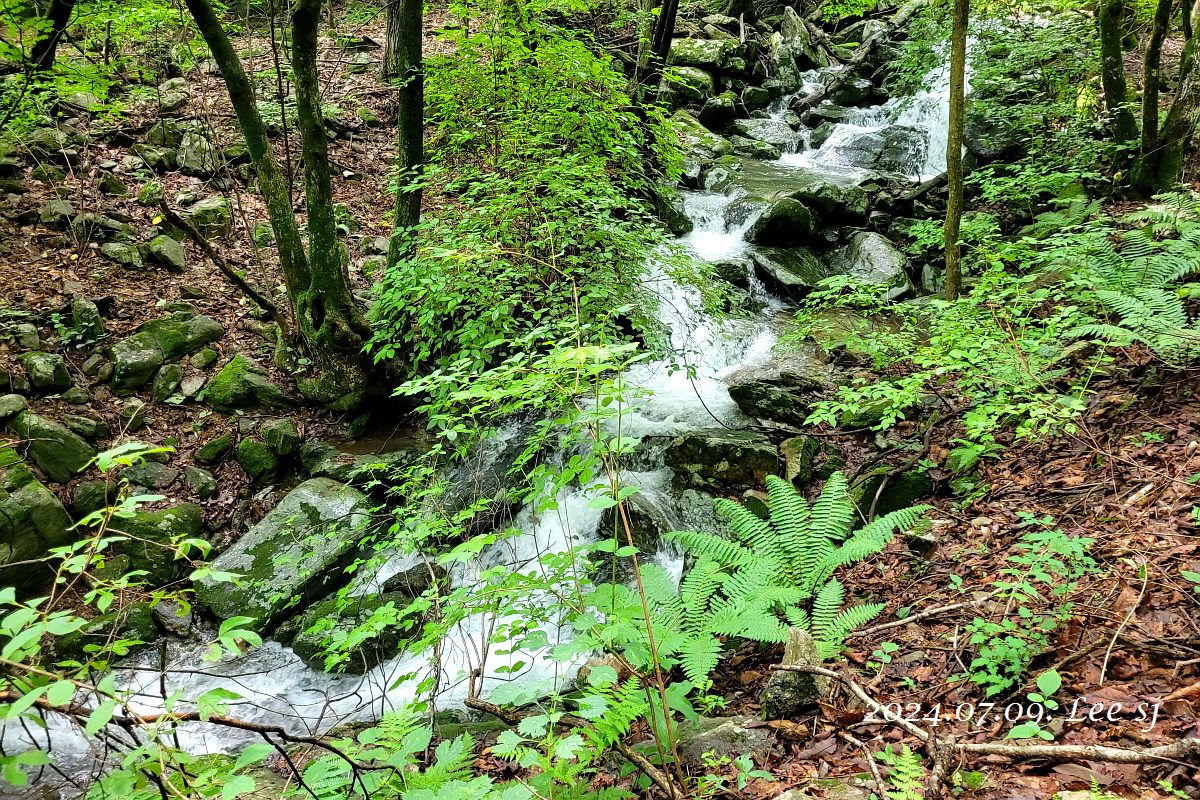 어쨌거나 이 더운 여름에 정상(829m)까지 오르기엔 걸음 속도가 느려 후미 대장이나 일행들에게 민폐될까 싶고, 너무 힘들겠기에 2진으로 계곡과 나란히 하는 둘레길이나 걷다 내려올까 하고 주차장에서 우측으로 1진 올려 보내고 반대 왼쪽 방향 계곡 옆으로 들어서서 시원한 계곡물 소리 들으며 걷기 시작(09:30).