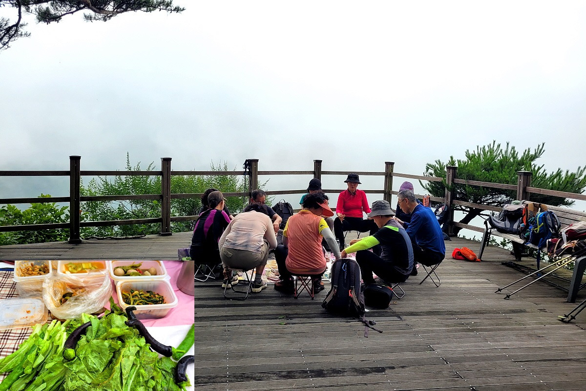 능선에 올랐더니 다른 팀 일행 대 여섯 명이 밥 먹을 준비를 한다. 옥ㄹ씬 우리팀인 줄 알고 불러대다 머쓱해 하니 "저 아래 데크에서 밥 먹는 일행이 있다" 하여 부지런히 내려 딛으며 그리로 와달라 부탁하고 내려갔다고 알려준다.