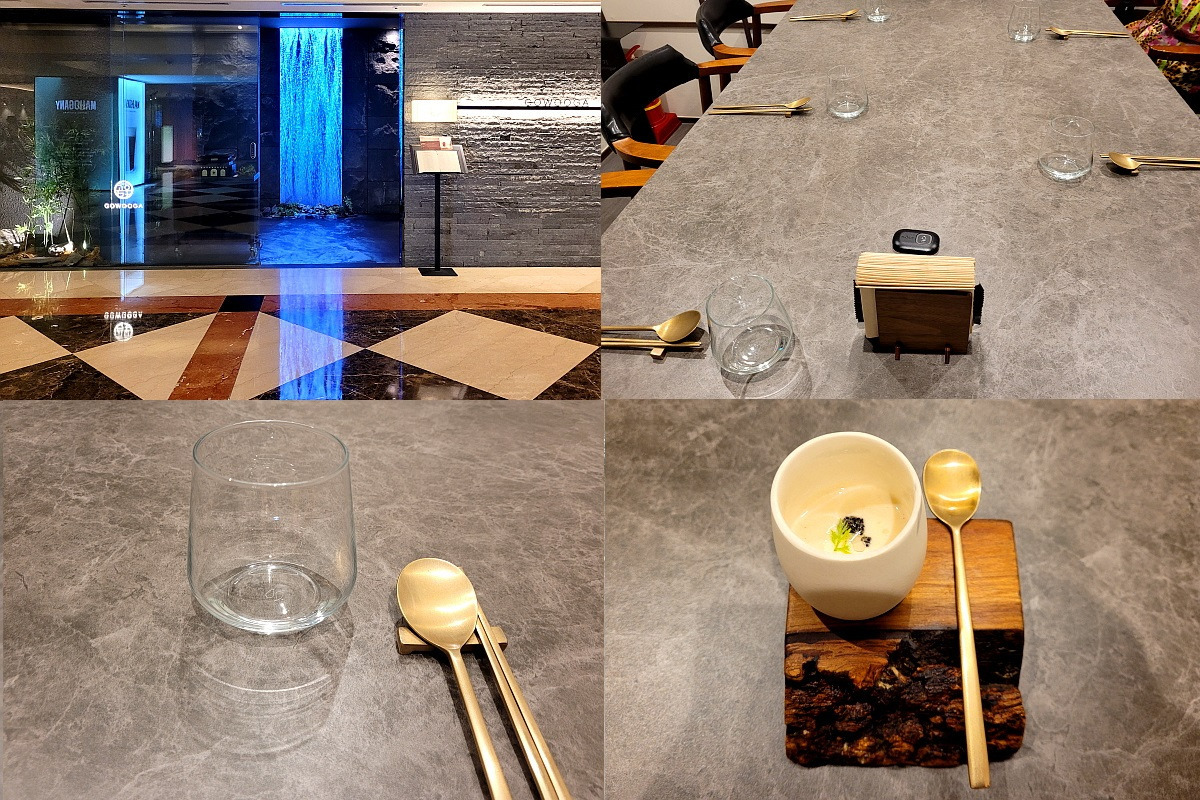 바지락 스프(바지락과 우유, 팽이처럼 아래가 뾰족한 그릇, 구멍을 낸 나무판에 올려 놓았다)