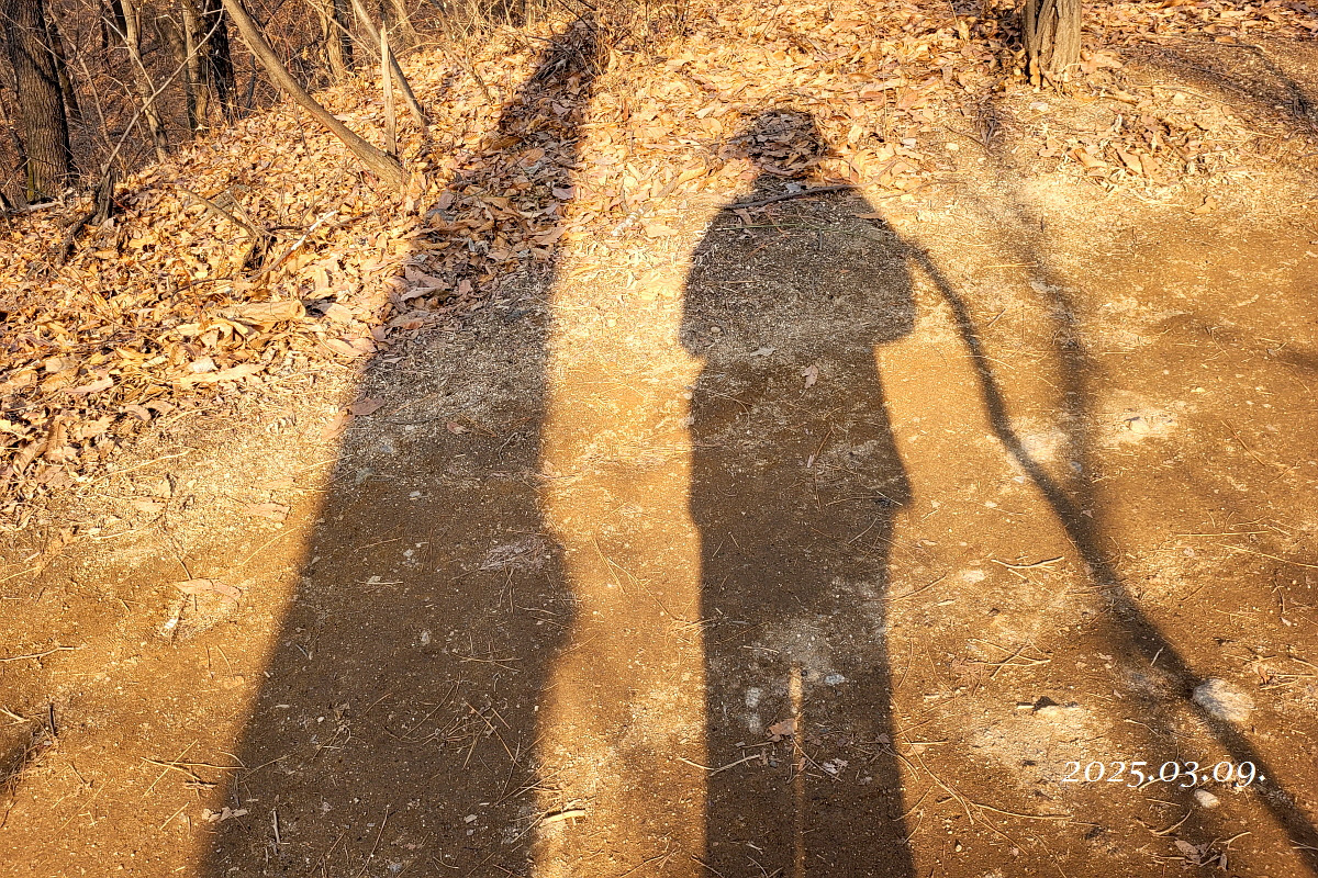 돌아오는 길, 그림자 길이가 나무처럼 길어지니 와 닿는 바람이 쌀쌀하다. 장갑 낀 손이 차가워져 서둘러 속도를 내 계단을 오르니 등에선 땀이 흐른다. 꼭대기 의자에서 잠시 쉬고 하산, 며칠 연속 걸어도 지난 초하루 날처럼 아프지 않아 얼마나 다행인지... 다만 걸음 속도는 현저히 다르게 느려진 것이 느껴지지만 나이가 있는데 젊은이들 걸음과 같을 수야...