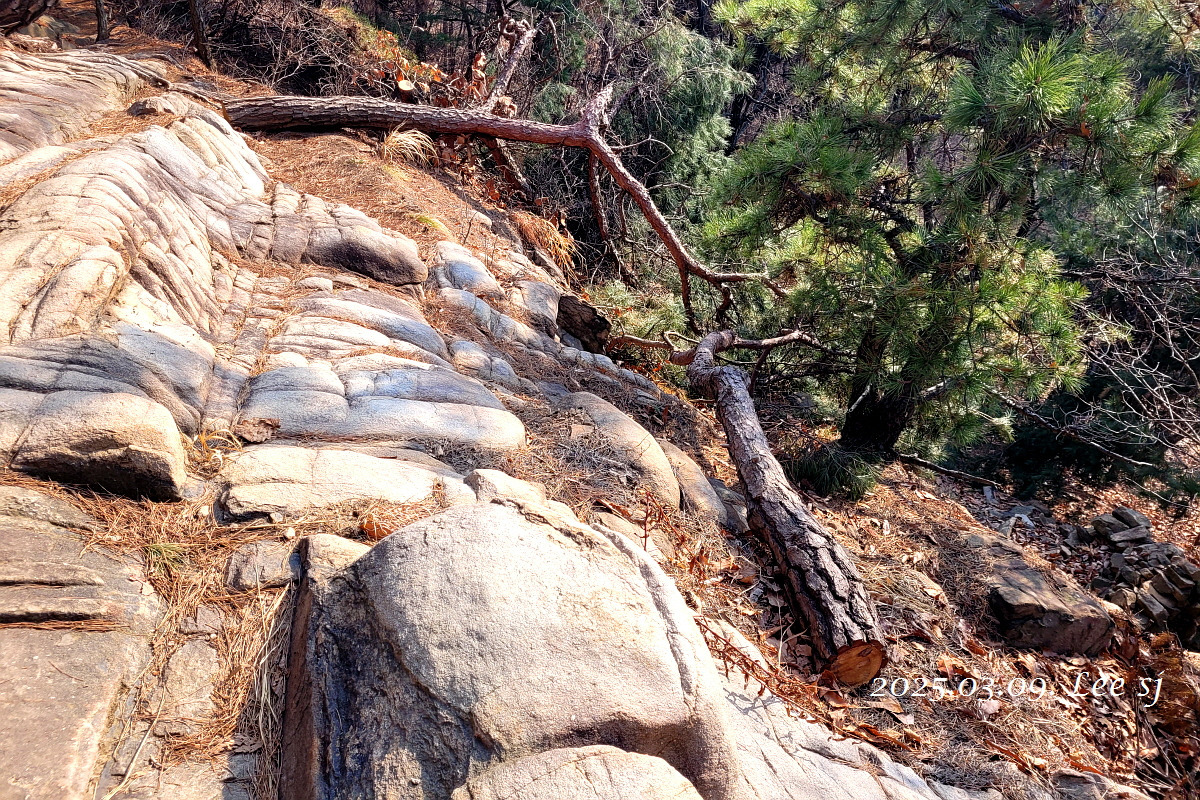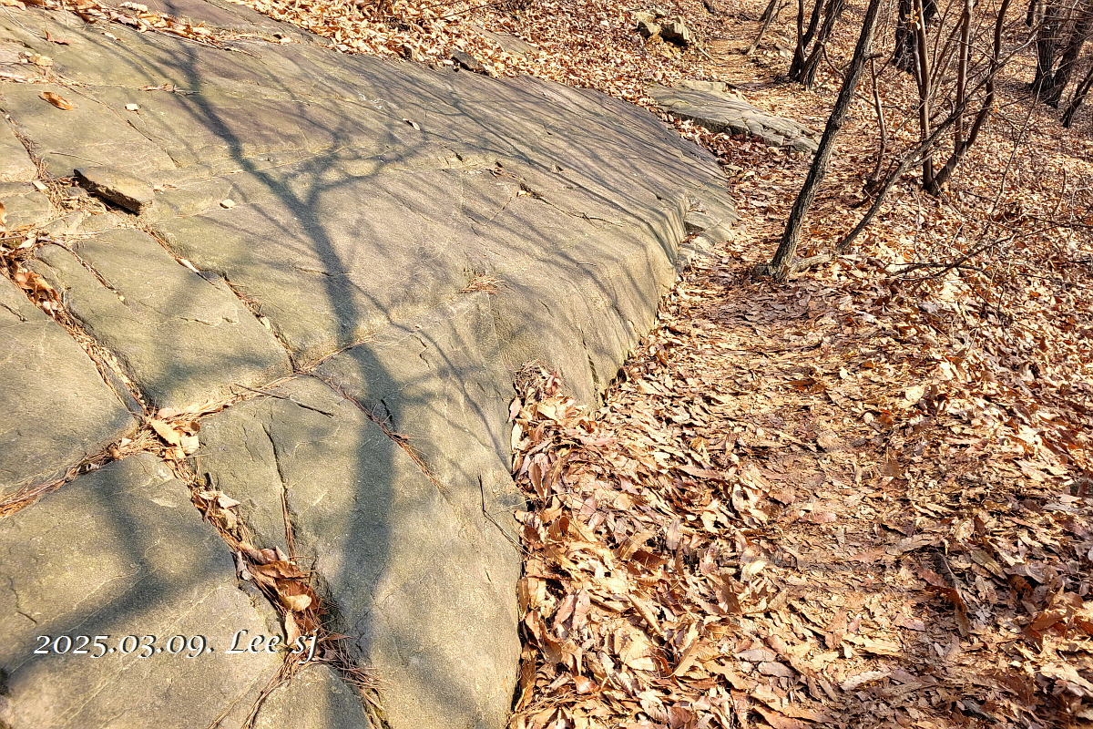 날씨 풀린 주말 낮시간이라 그런지 다른 때 보다 산책 나온 사람들이 많아져 가고 오는 이들로 데크길이 좁게 느껴져 한동안 다니지 않던 산 아랫쪽 호젓한 길 택해 걸으니 전망대는 들릴 수가 없었고, 거리는 약간 길어진 셈, 오거리로 올라와 잠시 쉬며 물 한모금 목 축이고 정상으로 향했다.
