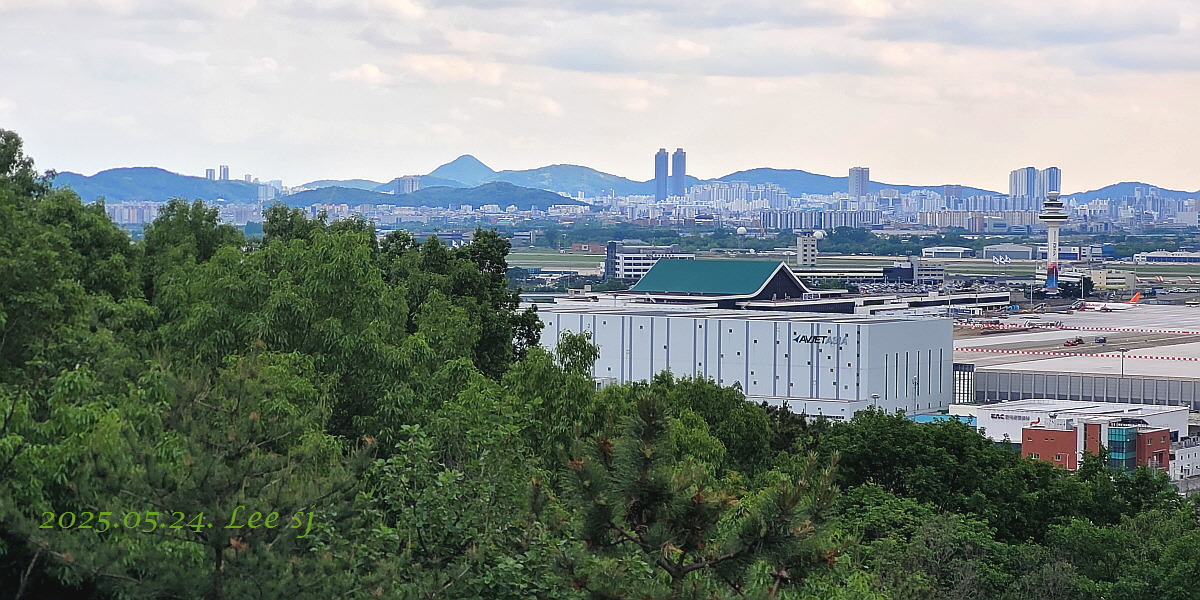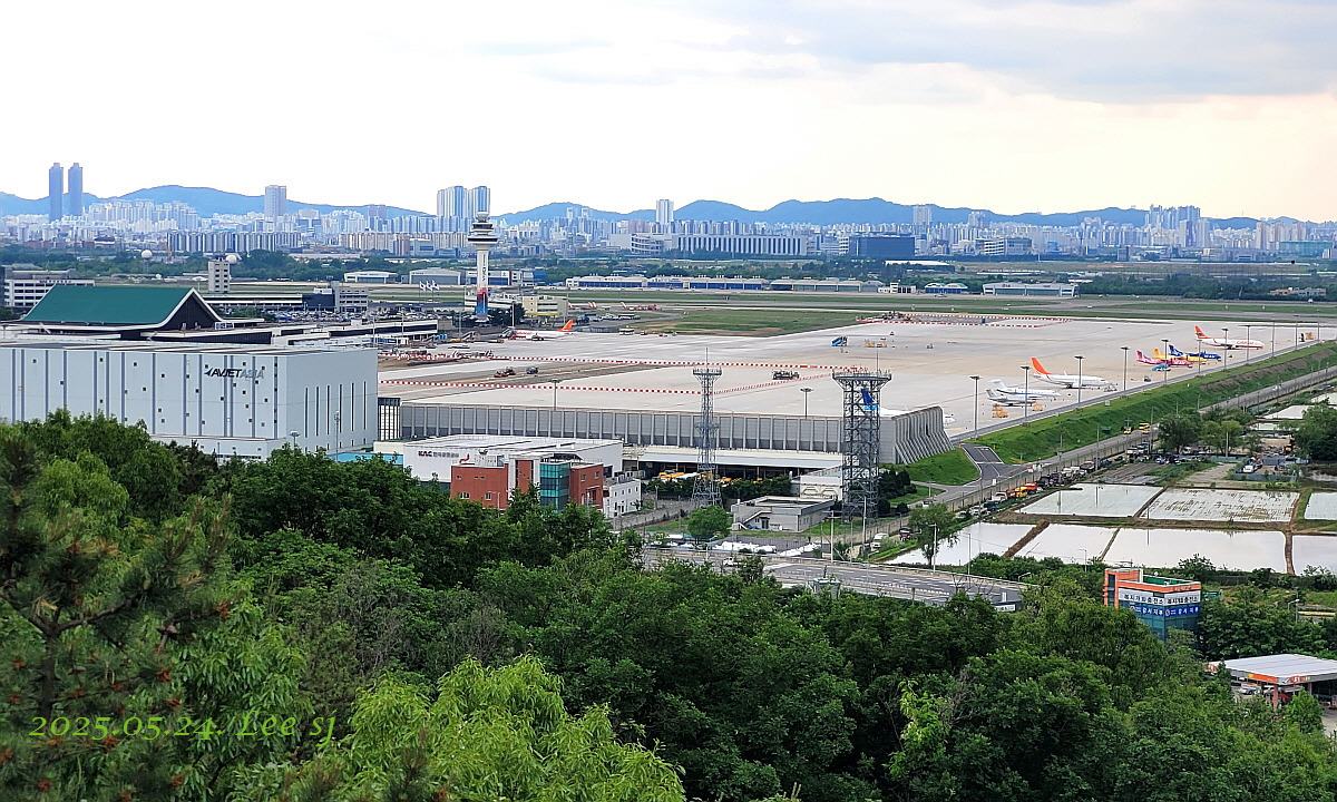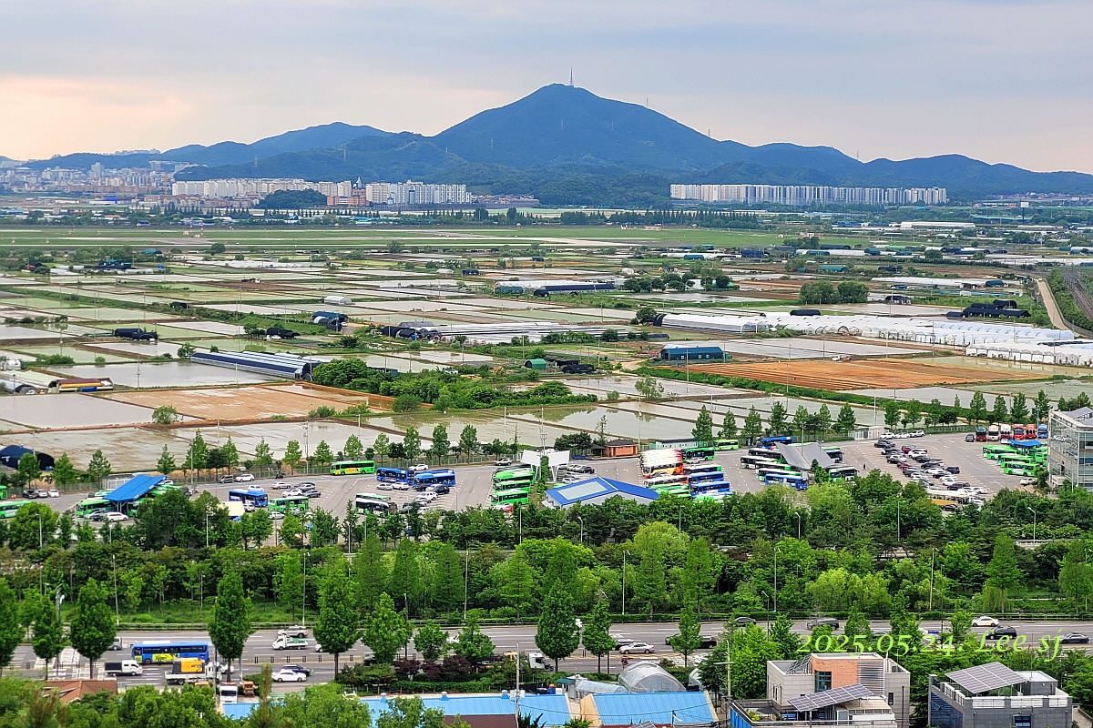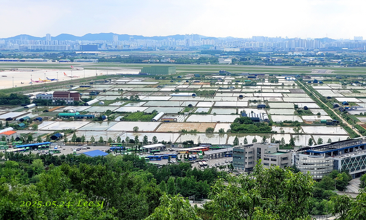 공항 활주로 근처 벌판 논에 모내기로 물이 차니 날씨는 흐려도 보기엔 색감이 아름다운 그림 같고, 새벽에 비가 조금 내려 그런지 가시거리가 길어 먼데 있는 산까지 잘 보인다.