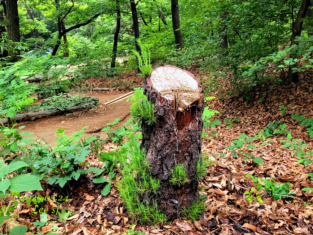재선충 영향일까 지난 겨울에 커다란 소나무가 많이 부러져 베어낸 곳이 여기 저기 많다. 한 바퀴 돌아 오는 길 소나무 베어낸 자리가 유난히 하얗게 보여 가까이 다가가 보니 송진이 나와 베어낸 자리의 수분 증발 못하게 다 막아 놓고 여기저기 껍질 사이에선 새 가지가 될 어린 싻이 솟기에 잘 자라도록 소나무 굵은 밑둥 타고 오르던 담쟁이 덩굴을 주변의 뿌리까지 다 뽑아 내고 활엽수 잎에 덮히지 않도록 가까이 있는 다른 작은 나무들도 제거해 주었다.