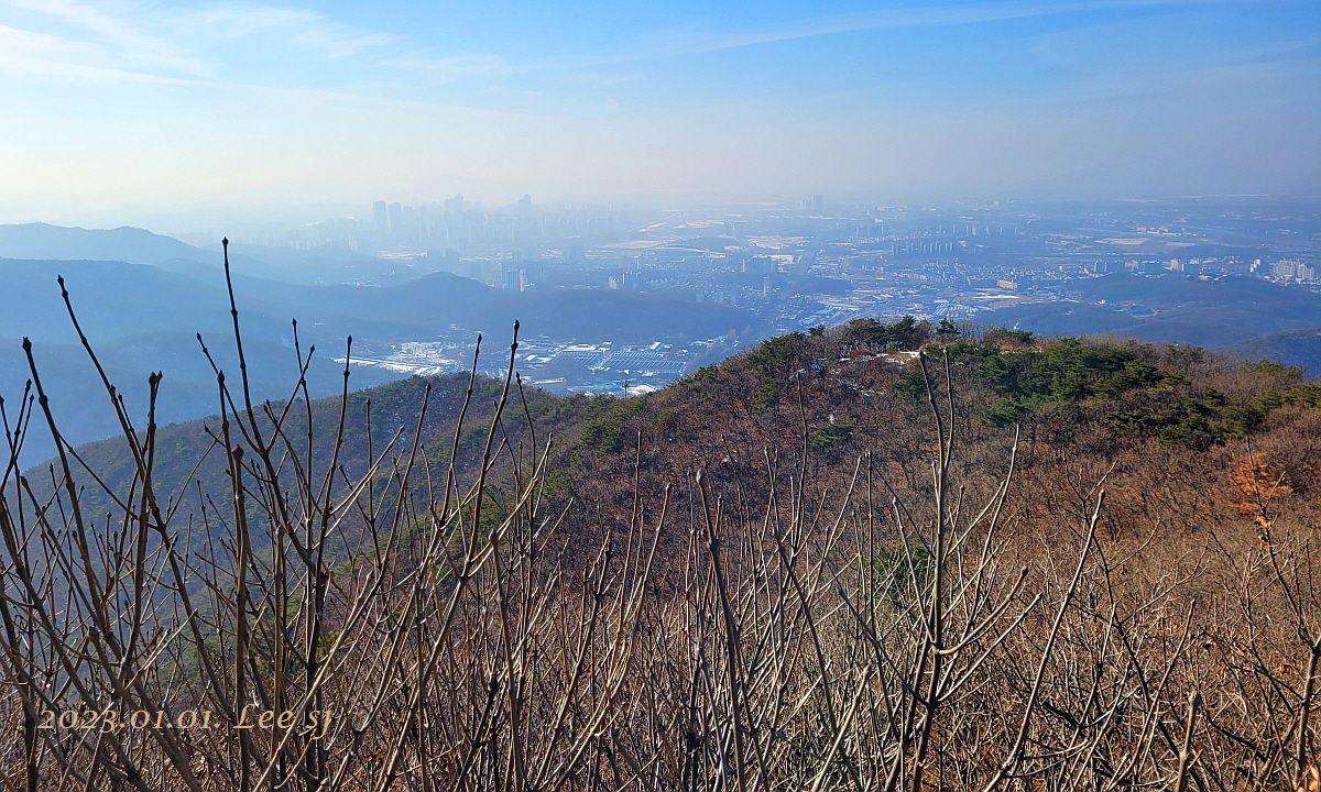 정상에서 어제 갔었던 정서진 바라보니 미세먼지가 심해 영종대교 조차 잘 안보인다.