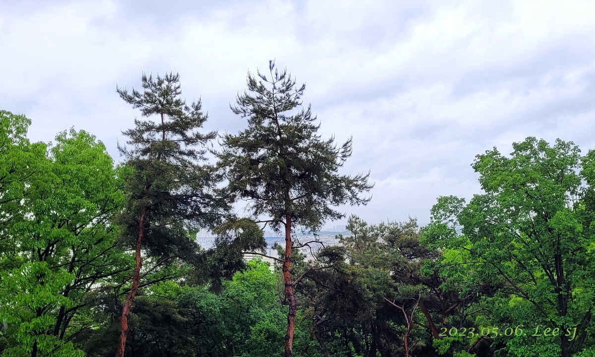 점심 식사 후 우산 들고 나서며 빗물에 미끄러질까 산길 대신 포장도로 이용하니