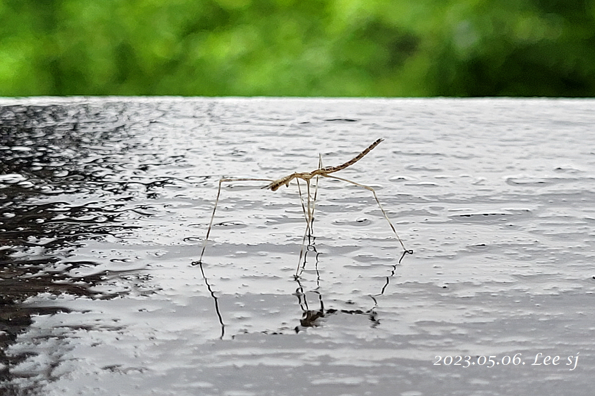 데크길 난간에 작은 생명체 하나가 빗물에 반영되는 그림자를 만들며 지나간다.