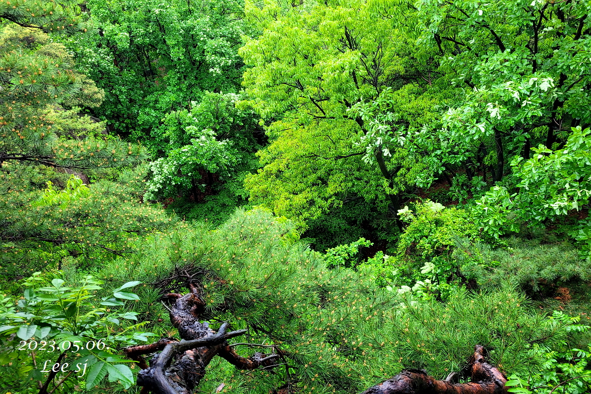 내리막 하산길엔 쪽동백 은은한 향기가 숲 속을 진동시키고, 날씨가 개이려는지 바람이 인다.