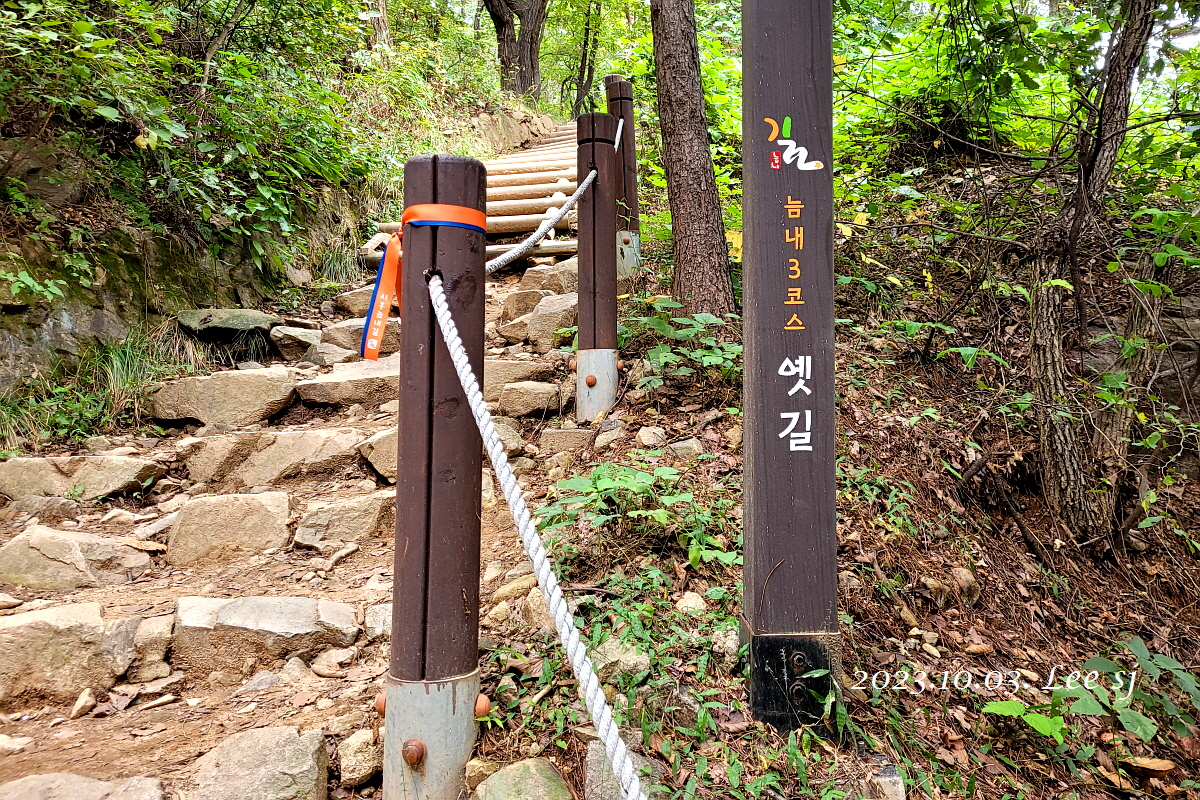 소래산은 다녀(7/8)온지 석 달만에 다시 찾는다. 들머리 시작은 지난번 처럼 ABC 행복타운 건물 후문 쪽, 지난번엔 화장실 우측 길로, 이번엔 죄측길 택하니 돌계단부터 시작 되는데 많이 가파르고 끝이 안보이게 길게 이어진다. 길고 가파른 돌계단이 끝나는가 하면 다시 통나무 계단이 지그재그로 한참을 이어진다. 통나무 계단을 다 올랐나 싶으면 다시 난간이 있는 나무 계단, 방향이 바뀌며 이어지니 끝은 보이지 않아 시간 보다는 공간 이동이 더 힘들게 느껴진다.