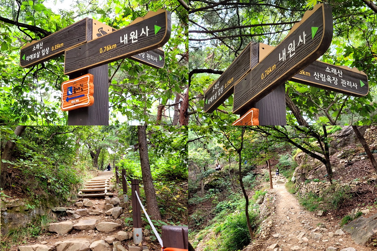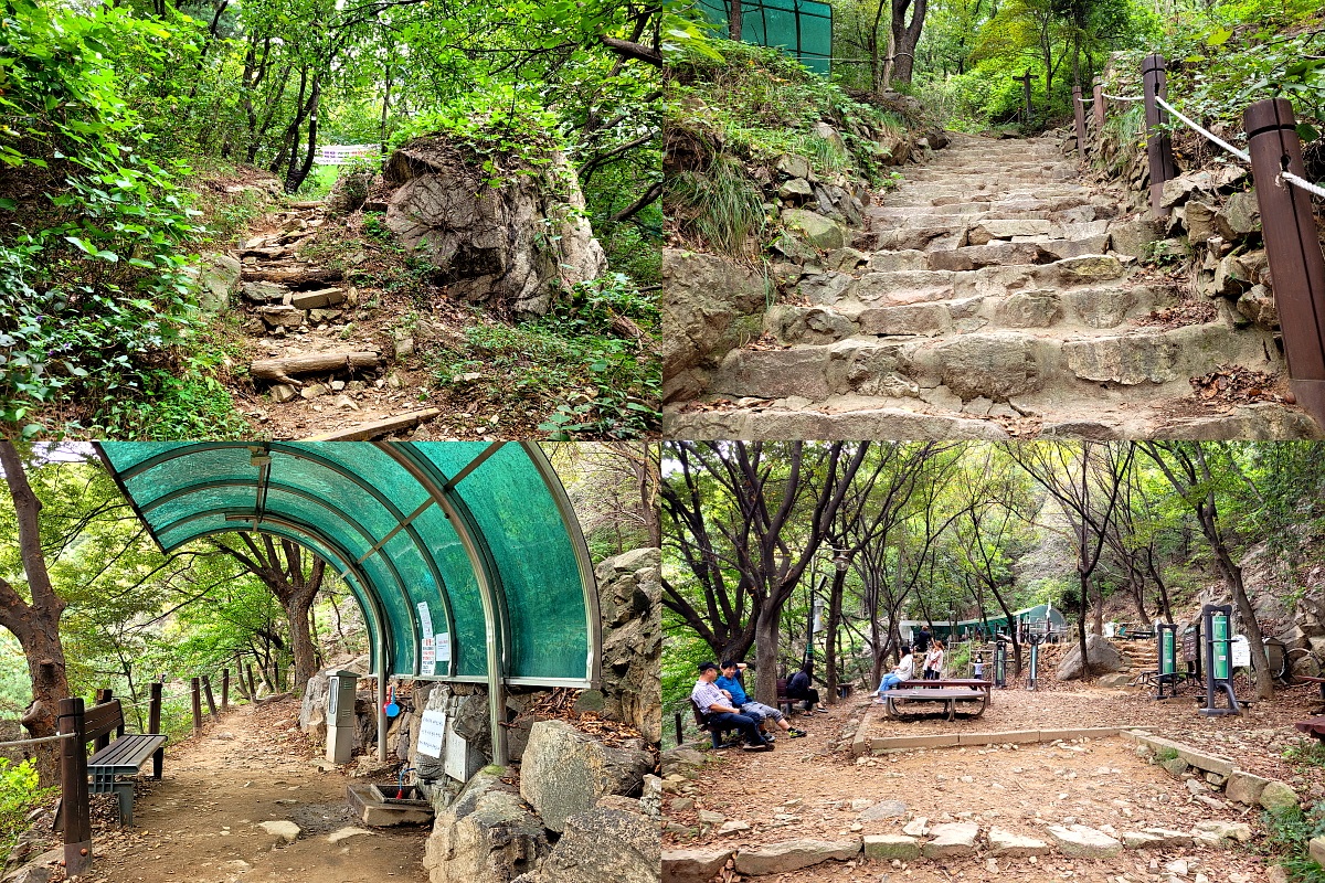 하산은 오르던 반대방향으로 내려딛다 쉼터에서 잠시 휴식, 물 한 모금 마신 후 낯선 길로 들어섰다.