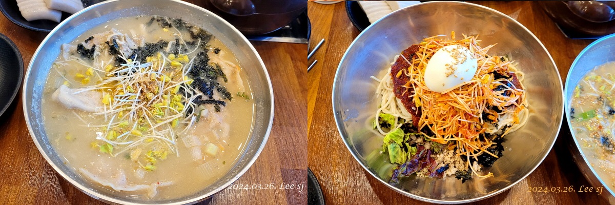 하산하여 단체로 춘천막국수 집으로 들어가 한 상에 네 명씩 앉아 희망하는 메뉴로 먹는데 우리 네 명은 만두국과 막국수, 재료가 메밀이라 많이 부드러워 먹기 좋아 맛나게 먹고 혼자서 지갑 여니 힐링도 된다.