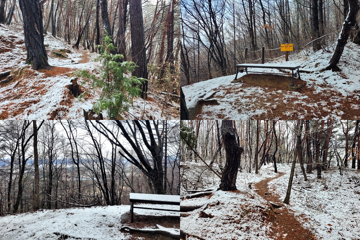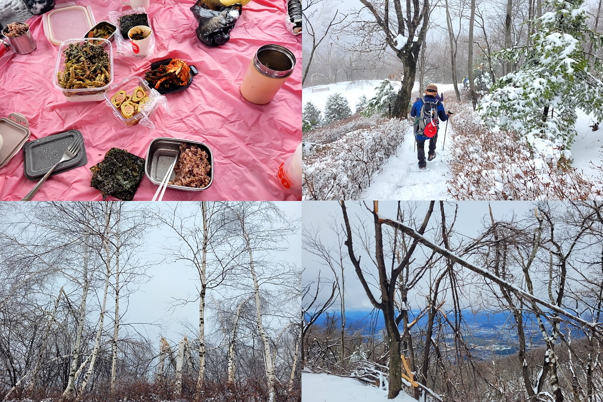 정상 전망대 아래에 자리를 펴고 점심식사, 넉넉히 싸왔다며 나눠주는 꿀맛 같은 밥 같이 먹고 하산 시작. 한 바퀴 도는 코스로 예정했지만 눈 쌓인 길이 분명치 않아 올라왔던 길로 되돌아 내려 딛으며 하산하니 그 사이에 눈이 많이 녹아 오를 때의 환상적이던 분위기와는 많이 다르다. 하산지점 다 내려오니 햇님이 반짝, 흰구룸 두둥실 파란 하늘이 축복해 주니 감사한 마음 뿐이다.