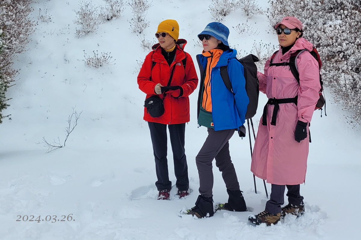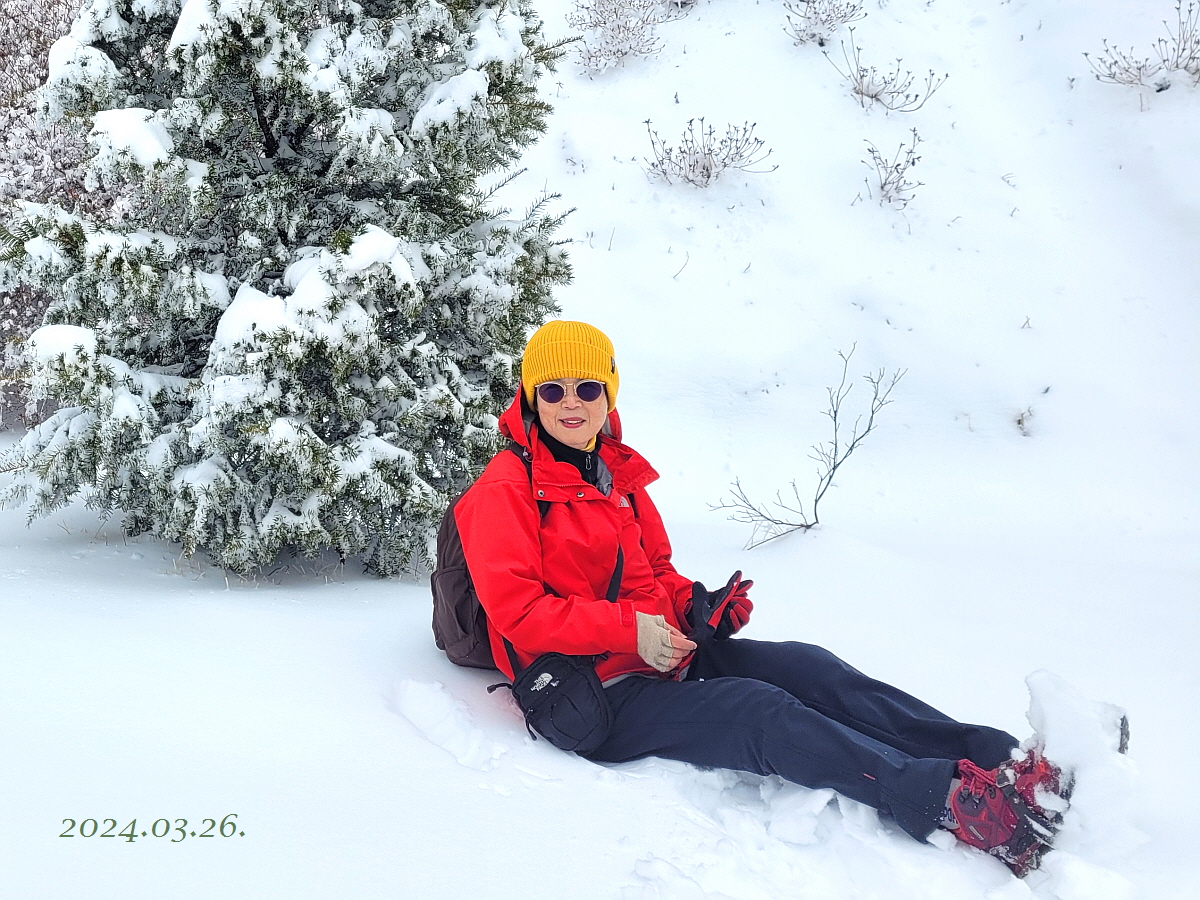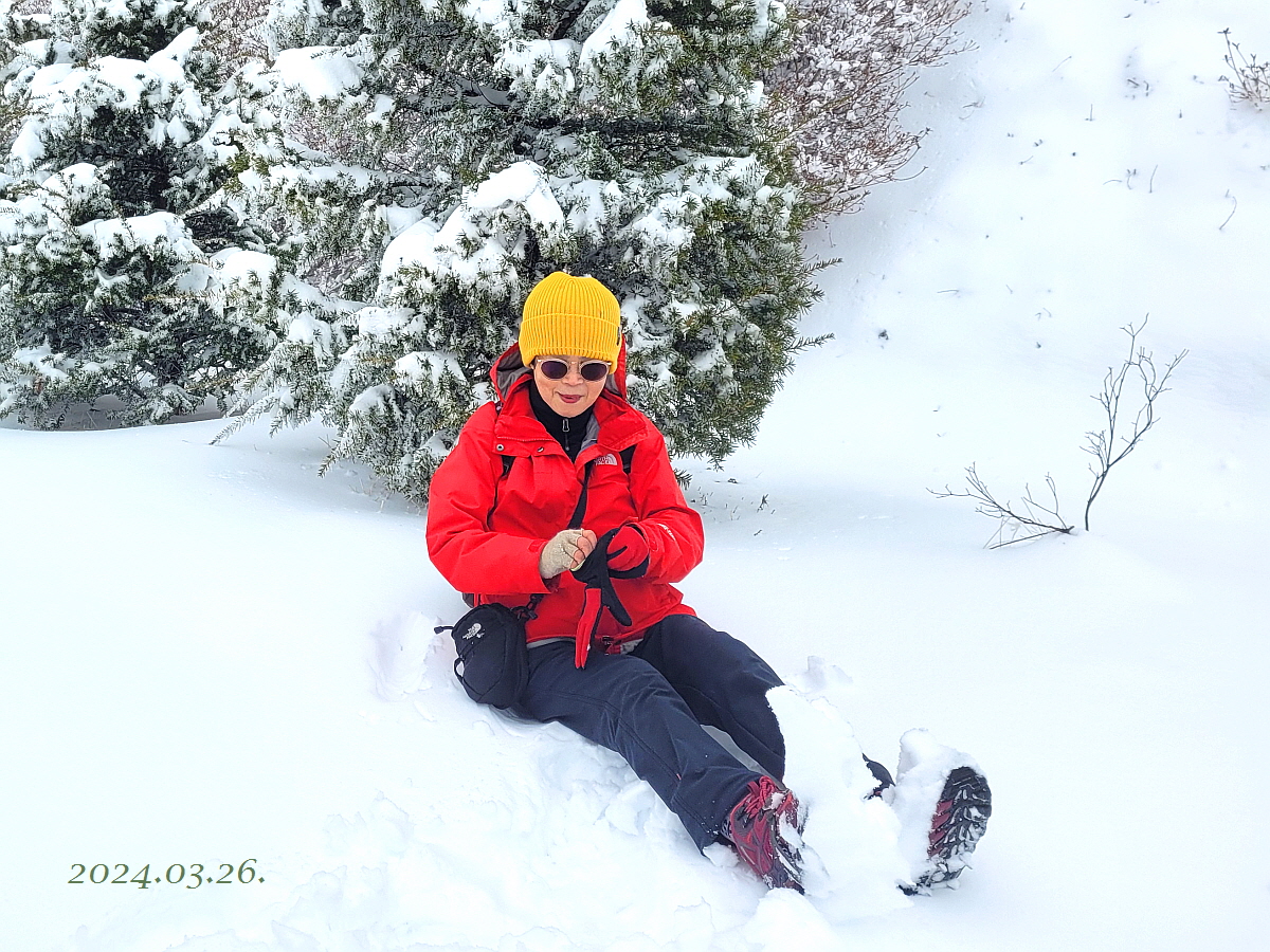 아래에 없던 눈이 고도가 높아질 수록 적설량이 많아 진다. 포근한 봄날씨에 한겨울 만큼 적설량이 제법 많아 몸은 힘들어도 기분은 베리굿 이다.