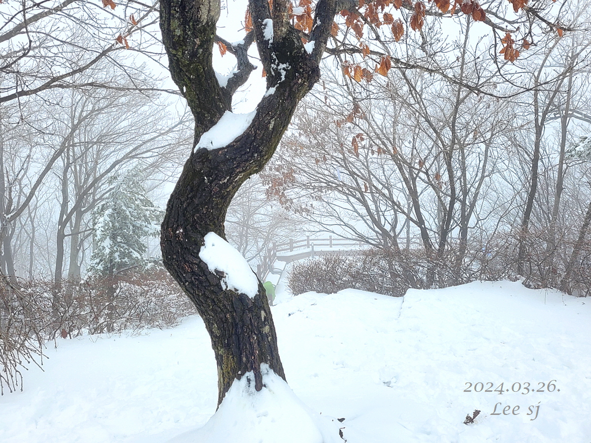 정상에서의 점심 식사 후 한 분이 나무에 쌓인 눈을 보니 본인의 심정과 같다며 흰 눈 위에 낙서?를 하신다.