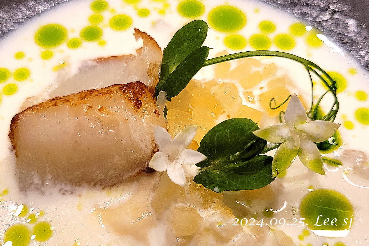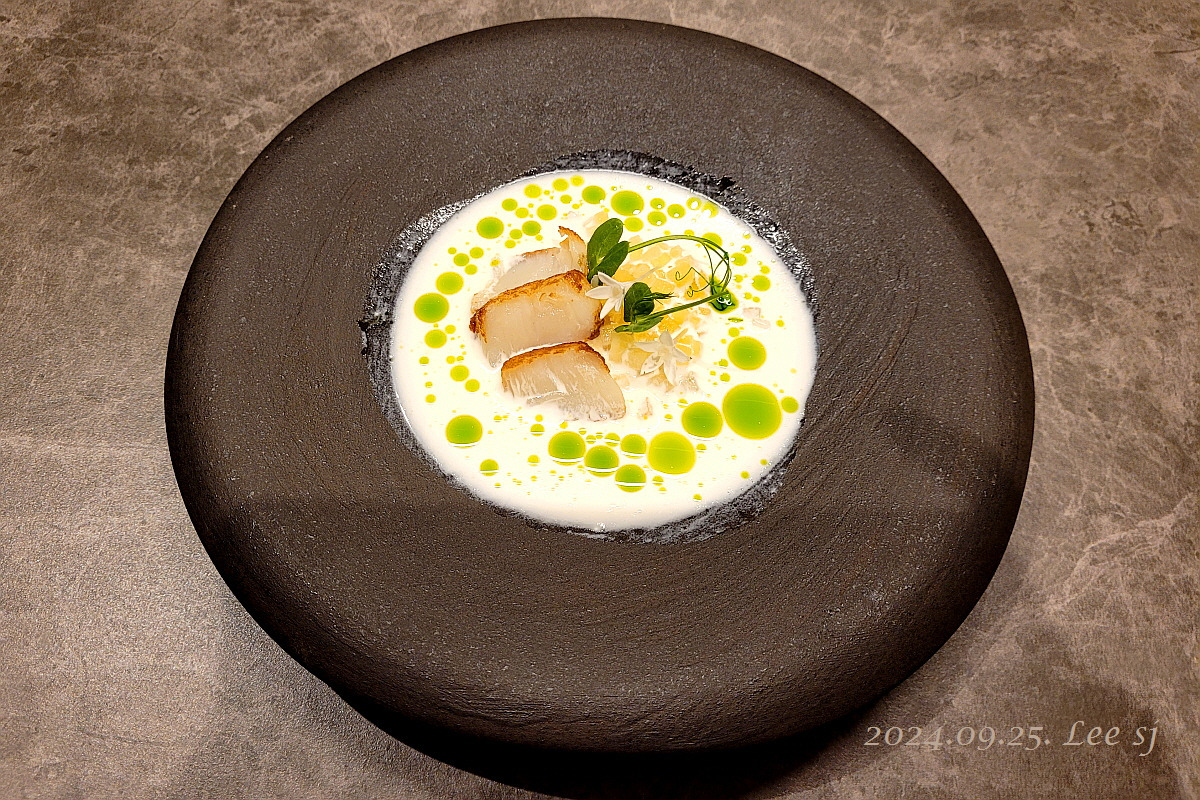 가리비 관자 (시원 상큼한 맛, 보일듯 말듯 작은 꽃들과 푸른 잎이 인상적, 소스가 제일 맛있는... )
