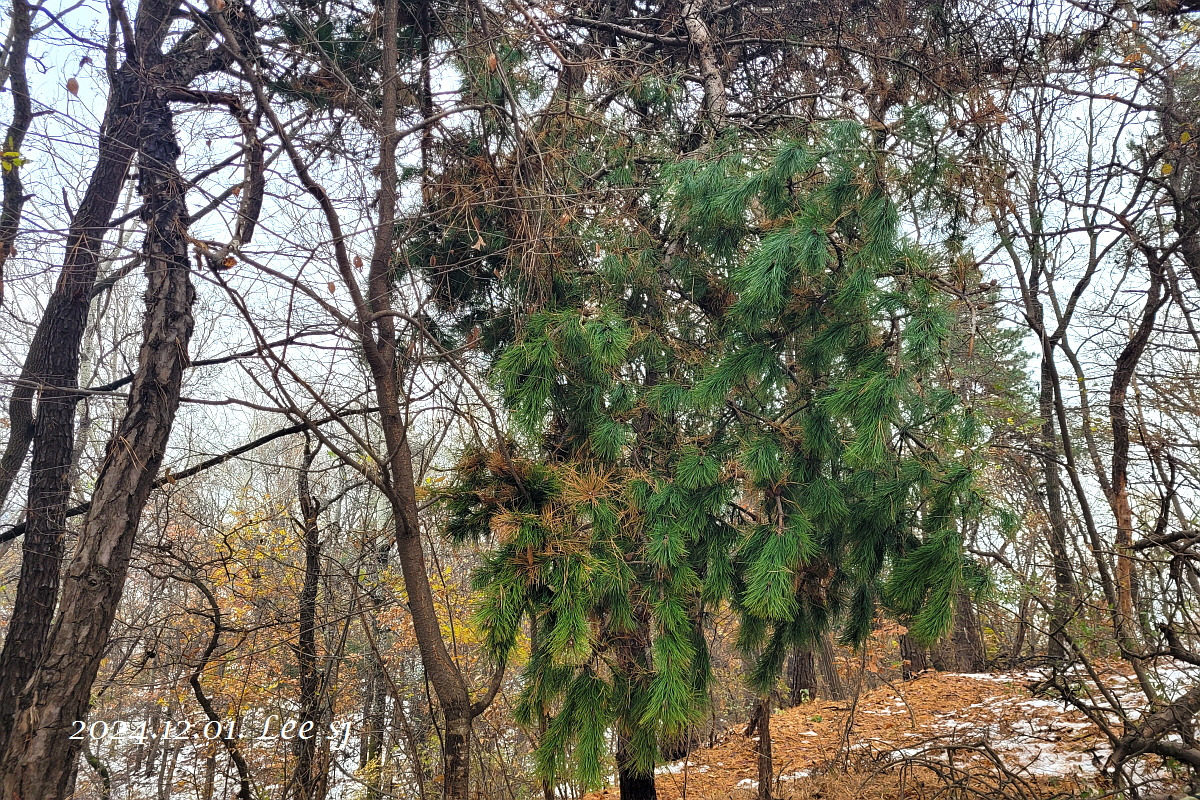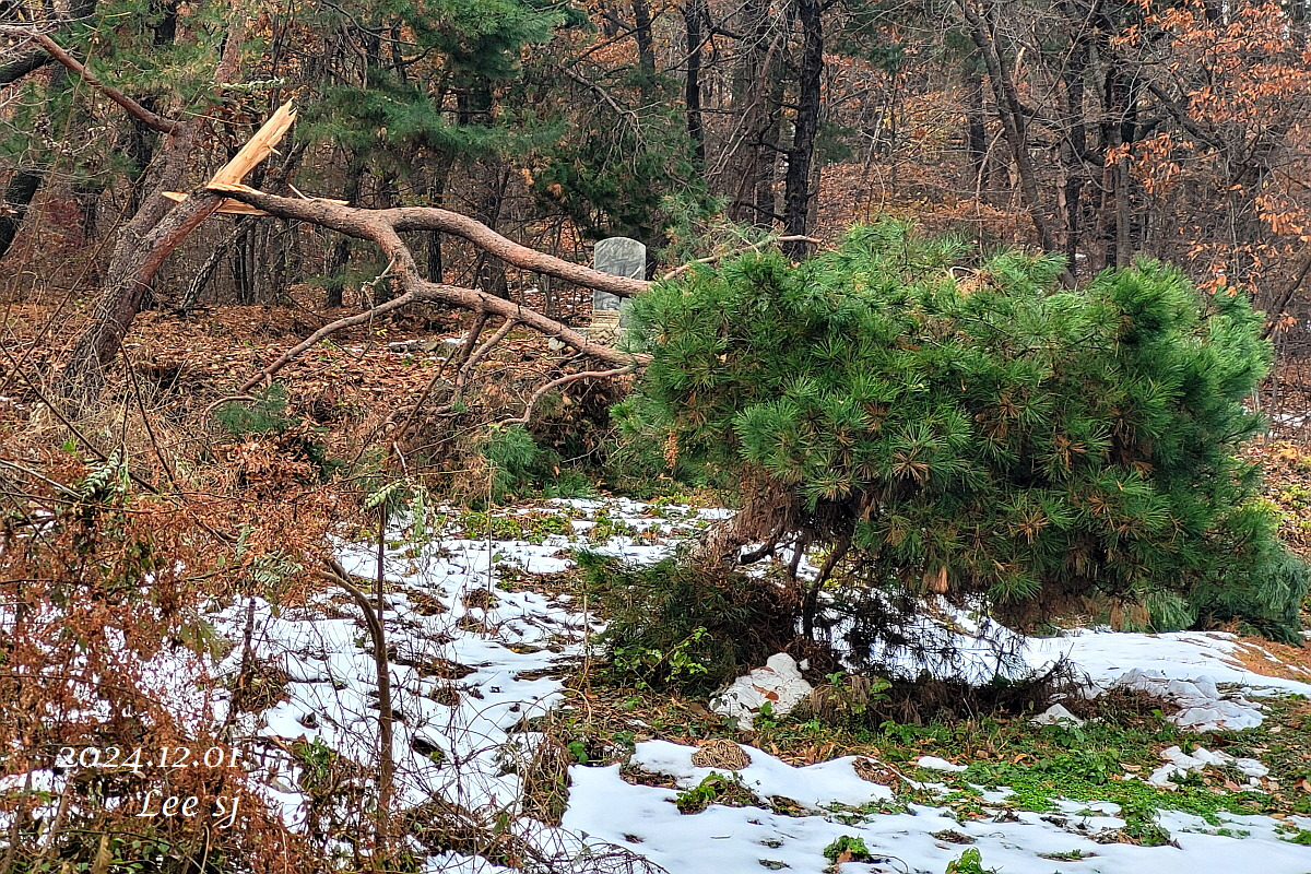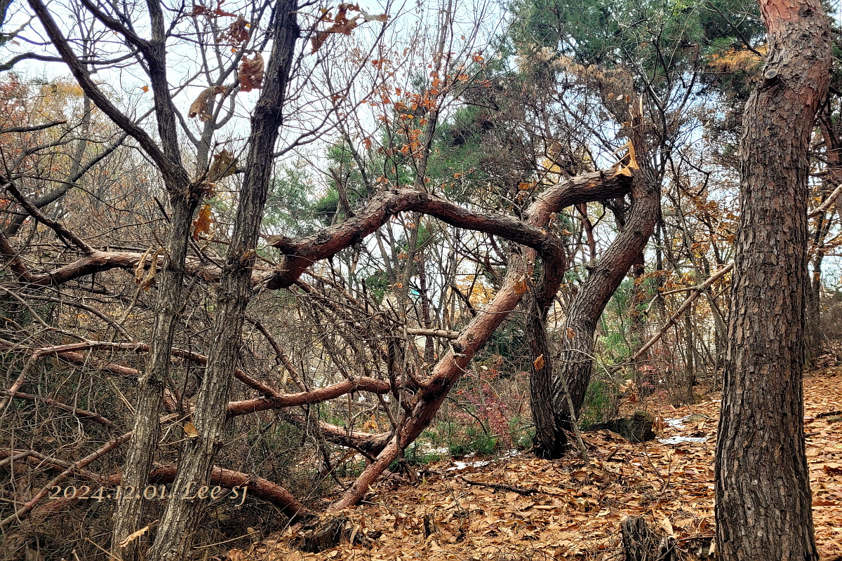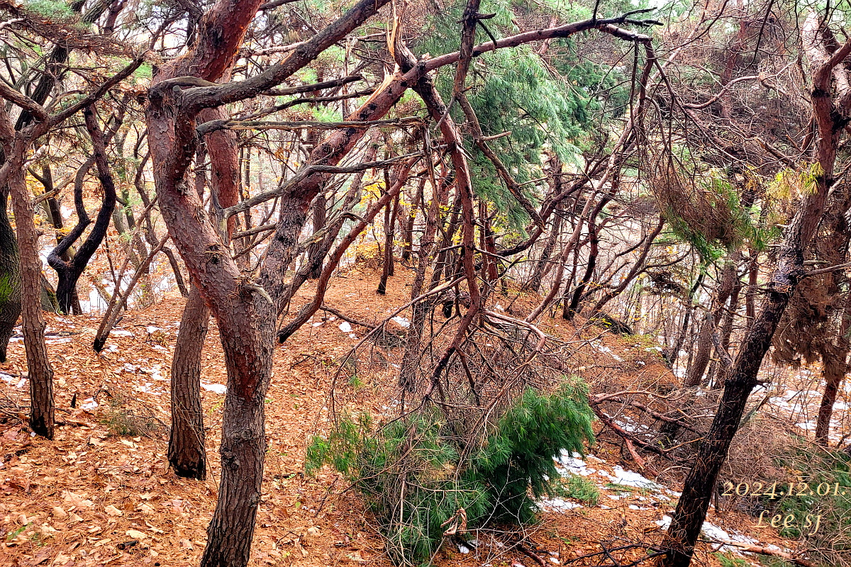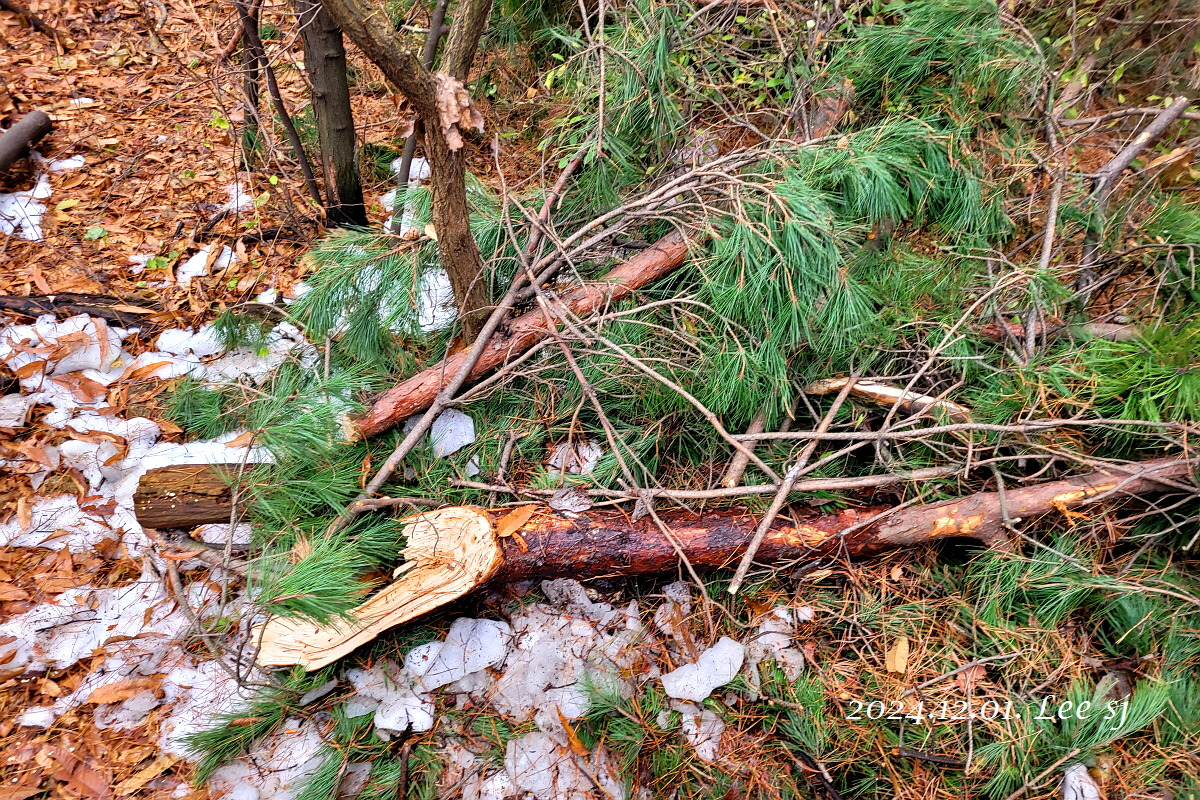 나흘 전 내린 첫눈은 적설량이 많다 보니 아직 다 녹지 않았고, 습기가 많은 습설이라 굵은 소나무 가지 부러진 나무들이 군데 군데 여러 곳에서 눈에 띄었고, 아직 잎이 떨어지지 않은 단풍나무나 밤나무 가지도 부러진 것이 눈에 띄었다.