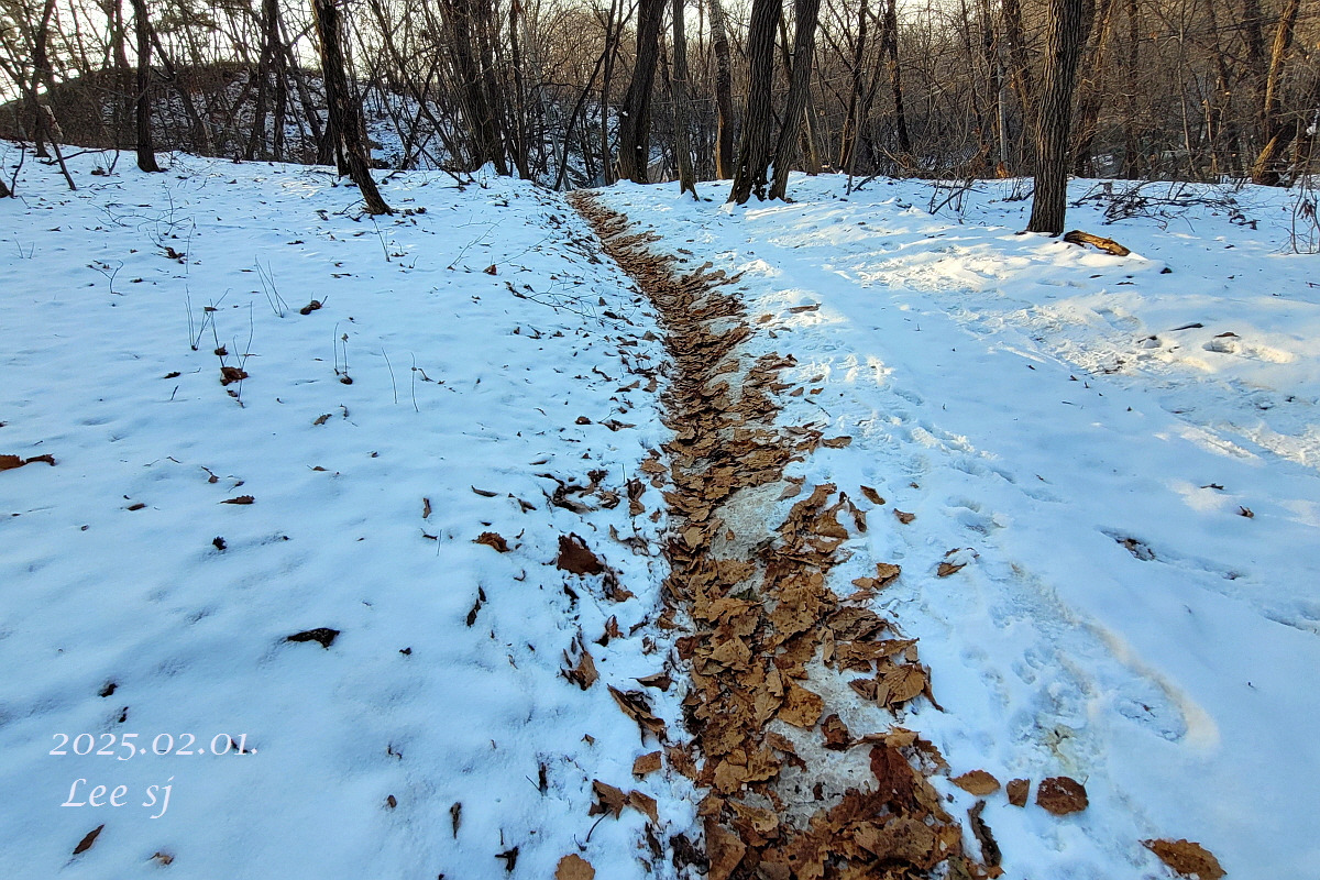 긴장하기 싫고 아이젠 착용하기 귀찮아 하산 길은 거리가 좀 짧지만 넓은 임도 옆 데크길 택하니 '언제 눈이 왔었나?' 라는 듯 뽀송뽀송하다. 염화칼슘께나 뿌려졌으리라. 한 달여 전 첫눈 왔을 때도 꽈당 미끄러졌던 도로인데...