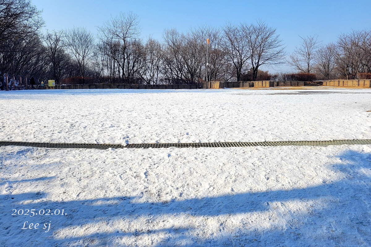 넓은 헬기장은 햇볕이 종일 드는 양지 건만 막힌 곳 없이 찬바람을 맞아 그런가 눈이 하얗게 그대로 덮혀 있다. 잠깐 오르는 비탈면엔 염화칼슘을 지나치게 많이 뿌려 그대로 남아 있다.